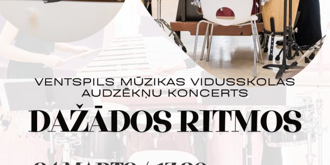 Aicinām uz koncertu! 24.martā plkst. 17:30 notiks Ventspils Mūzikas vidusskolas audzēkņu koncerts “Dažādos ritmos”. Piedalās Ventspils Mūzikas vidusskolas sitaminstrumentu spēles un flautas spēles audzēkņi. Ieeja bez maksas.